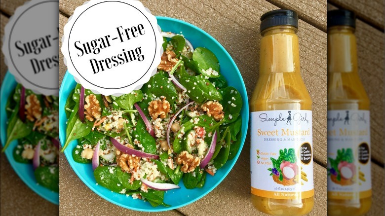 If you're searching for a completely sugar-free salad dressing, look no further than Simple Girl Sweet Mustard Dressing & Marinade. In a 2-tablespoon serving, this dressing has a mere 3 calories — which isn't even enough to make up a single gram of fat, carbs, or protein.