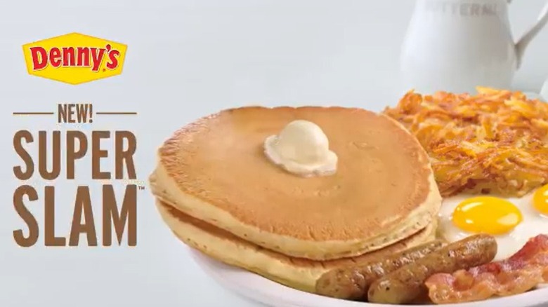 What exactly is the Super Slam breakfast? According to a May 15 press release, Denny's refers to it as "America's biggest breakfast" — and for good reason. This impressive breakfast spread features two buttermilk pancakes, two eggs (cooked however you would like), two bacon strips, two sausage links, and a heaping portion of hash browns. Compare the Super Slam breakfast to the classic Grand Slam breakfast, which features all of the same items sans hash browns. With a veritable buffet of pancakes, meat, and hash browns, Denny's certainly isn't joking about it being a very large — and perhaps one of its more calorie-heavy — breakfasts.