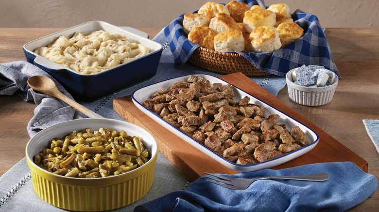 If you'd like a little more variety for your guests, check out the Sirloin Steak Tips n' Tenders Family Meal Basket. In addition to steak tips, this catering option also features 10 breaded chicken tenders — either fried or grilled — as well as dipping sauce, buttermilk biscuits, and a choice of two side dishes. Because no summer party or dinner can go without refreshing beverages, you can also snag a half-gallon of strawberry lemonade. Planning an event this summer? Then check out Cracker Barrel's catering menu to see the complete list of selections and conveniently place an order.