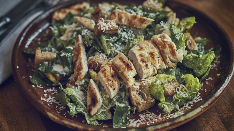 Here's an idea for a one-pan roasted romaine salad that makes a full meal in 45 minutes with minimal prep: spread out cubed and seasoned chicken, grape tomatoes, garlic gloves, and romaine hearts on a baking sheet and roast them in the oven (via Rachel Cooks). Then, throw them in a bowl with your favorite dressing. You can also put a head of wilted romaine on the grill, chop it, and top it with a mayonnaise and mustard vinaigrette (via The New York Times). Add grilled chicken breast and croutons for a quick weeknight meal.