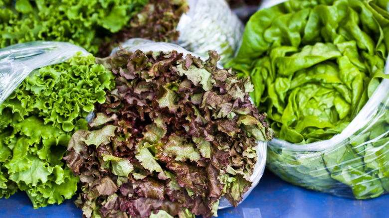Hitchcock Farms recommends storing iceberg lettuce in a perforated bag, and romaine lettuce in a "loosely closed" plastic bag. As for loose-leaf lettuce in bags, you can let the leaves breath by snipping open the bag when you get it home from the market and before storage. For varieties that come packaged in plastic clamshell containers, open up the box and first sift through the greens to spot any leaves that may have started to get brown or mushy (via Food & Wine). Toss those. Then, take some paper towels or a dry dishcloth and line the interior of the container to absorb excess moisture before closing the lid again.