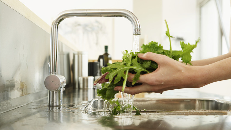 While Colorado State University Extension recommends not washing any type of produce until you're ready to eat it, Hitchcock Farms recommends giving certain types a rinse. Specifically, they say that loose-leaf lettuce packaged in a box or a bag should be rinsed before being stored, even though many types have already been pre-washed. This is to prepare it for cold storage and get rid of any dirt or other debris. The Centers for Disease Control and Prevention (CDC), on the other hand, says lettuce and leafy greens labeled "ready to eat," "triple washed," or "no washing necessary" do not need to be rinsed or washed again before eating.