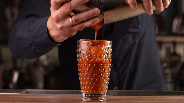 The allure of Bagel Bites was the fact that they were a super-simple way to serve a hearty snack. And John deBary's recipe sticks to that simplicity. To make the cocktail, start by infusing your vodka with everything bagel seasoning. Once infused, strain the mix and combine it with marinara sauce and lemon juice into a cocktail shaker. Add a few drops of your favorite hot sauce to give it a spicy kick, and then shake it up. Pour it into a parmesan salt-rimmed glass and top it off with a few delicious garnishes like pepperoni slices and a lemon wedge.