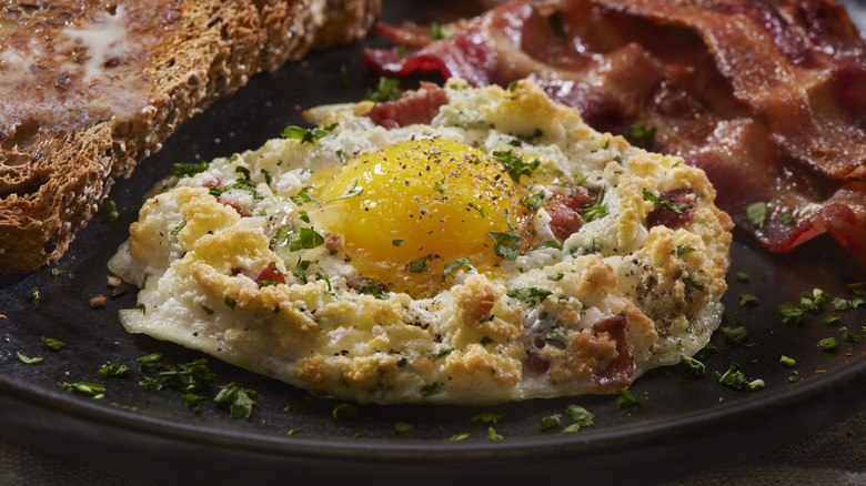Bacon and eggs go together well, of course. Instead of serving bacon strips on the side, you make them a part of your fried egg. Cook them first, then chop or crumble them up. You can add these bacon bits to the egg white while it's frying so they meld together, giving you a meaty, savory crunch with each bite. Or you can pepper them over the top as a crispy garnish. If you don't want to go the meat route, you can use toasted breadcrumbs, sesame seeds, or pepitas to achieve a similar texture.