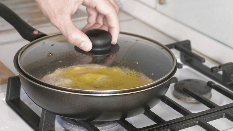 If you're not using enough fat to baste your eggs, there's another hack that can ensure your top is cooked through. Covering the egg while it cooks traps in steam, which circulates along the top of the egg, heating it evenly and more thoroughly than if it were left uncovered. Since this technique causes the top to cook faster than it normally would, you're more likely to end up with an egg that's evenly done from top to bottom.