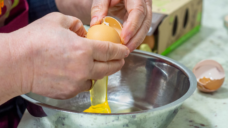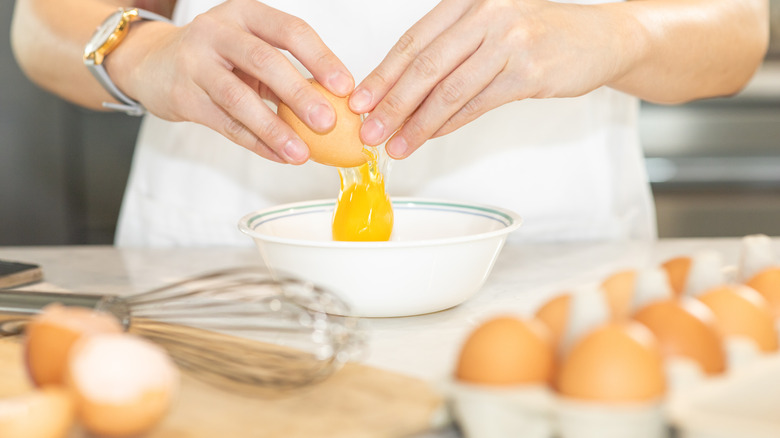 Sadly, there's no secret magic technique for cracking an egg perfectly every time. Every egg is slightly different, with thinner or thicker shells. Some eggs will cooperate when you try to break them open cleanly, and some just won't. That said, you can maximize your chances of success by using one simple hack — using a flat surface. This is one of the best ways to keep the yolk intact when frying eggs.