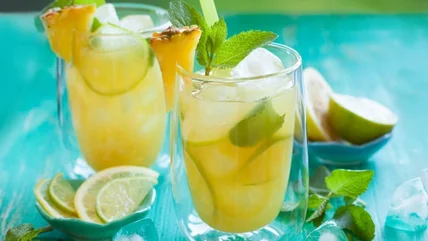 - Add the whiskey and lime juice to a Collins glass filled with ice.