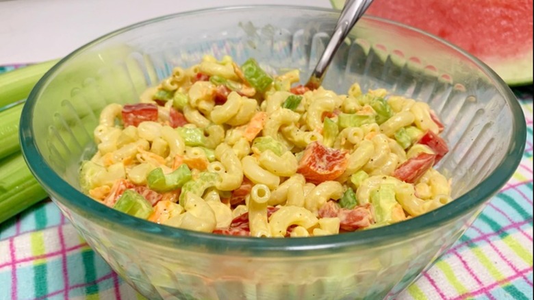 - In a medium bowl, mix together cooked macaroni, 1/2 cup diced bell pepper, 2 sliced scallions, 1/4 cup shredded carrot, and 1/2 cup diced celery.