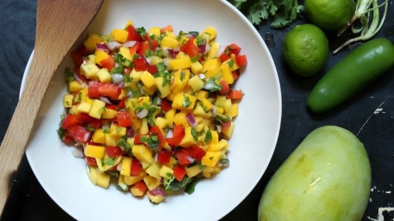 - Combine the diced mango, bell pepper, and red onion in a bowl. Add the minced jalapeño and chopped cilantro leaves and stir to combine.