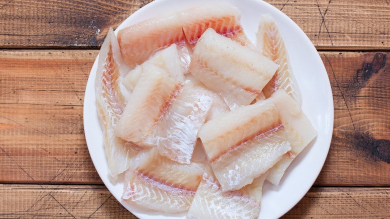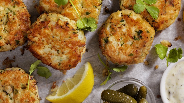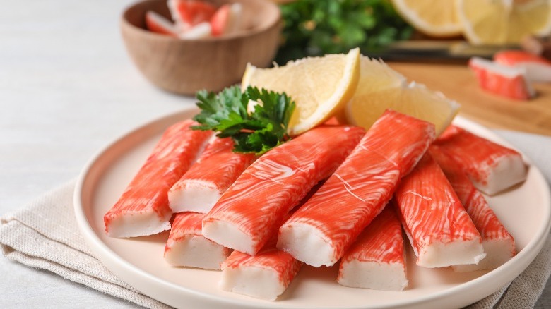 This all means that friends and family will see the reddish color and realize that imitation crab is being served. And then there's the texture. Real crab is much more delicate, while faux can be heavier, less flaky, and almost rubbery. It is also saltier. So when serving, the best advice is to be honest. Imitation crab might not be at the same level as real crab meat — but it is seafood. And it can be delicious when prepared properly.