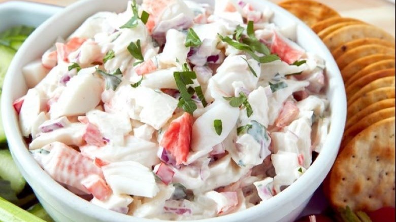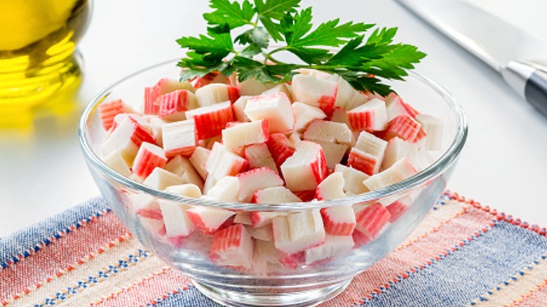 Imitation crab is also cheaper than fresh or frozen shrimp, so it's perfect for seafood salad. The most basic recipe simply combines crab, mayo, and spices, but it can be so much more. It can be made into a cool and creamy pasta salad or served atop lettuce and vegetables. Another option is to serve it warm with butter, kosher salt, and some black olives.