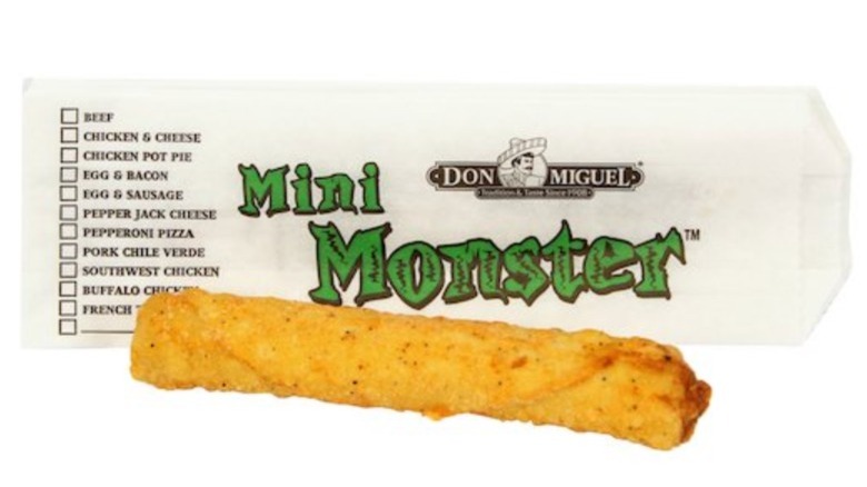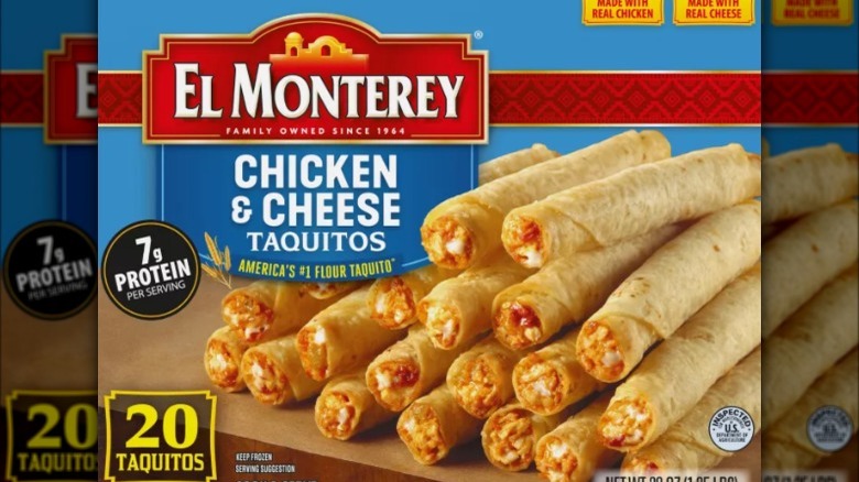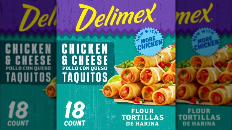While it's not necessarily a bad option, in last place is Don Miguel taquitos. This brand offers burritos, taquitos, and tacos. This brand offers a few different kinds of quarter-pound taquitos, including the monster egg and sausage taquito, the chicken and cheese taquito, and the spicy beef and cheese taquito. You can also purchase a pack of chipotle chicken flautas. These taquitos are a bit flimsier than a traditional taquito should be, which is why it's lower on this list. Additionally, the flavors all lack the intensity that you would expect from a taquito.