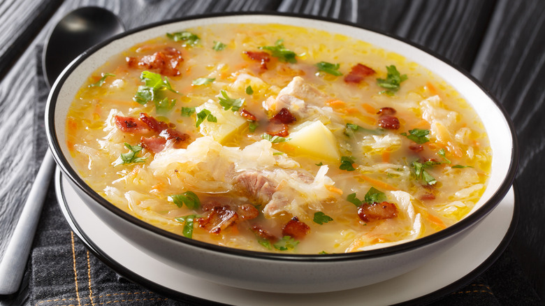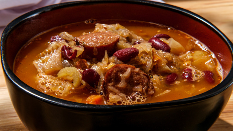 But you needn't use fresh cabbage to make your own spin on Ukrainian kapustnyak. Instead, use sauerkraut to make a tangier version of this soup. Making kapustnyak is as simple as throwing sauerkraut in a pot alongside some other vegetables like carrot, celery, and onion, and simmering it with some vegetable or meat stock. If you want to bulk it out even more, though, you can add in meats like bacon or sausage.
