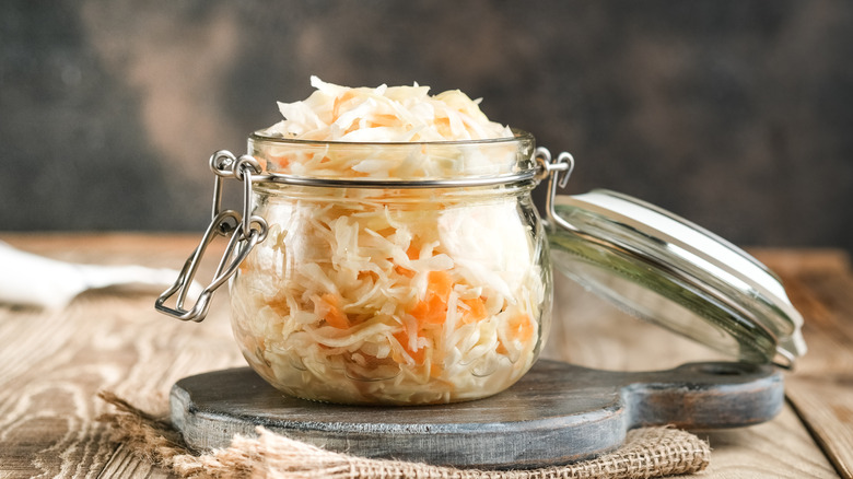 Fermented cabbage has never been so popular. While those two words don't necessarily sound like they'd equate to a tasty foodstuff, the popularity of sauerkraut and kimchi beg to differ. Sauerkraut is the less spicy of these two cabbage kingpins. Its tart, tangy flavor is a hit with folks worldwide. Aside from having a pleasant taste, it's also one of those foods that your body will love you for eating. Its probiotic effect can promote good gut health, and its abundance of antioxidants and fiber may have potential benefits for your heart and the prevention of chronic diseases, per BBC Good Food.
