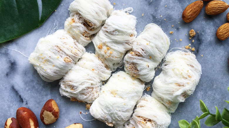 What differentiates Dragon's Beard is the filling within the silken strands — peanuts, sesame seeds, and shredded coconut, or some combination of the three, are popular choices. This delicacy, once available only in the highest echelons of Imperial China, is now a common street food. Dragon's Beard also directly inspired a Korean variant known as kkul-tarae, or Korean court cake, which is nearly identical in flavor and appearance.