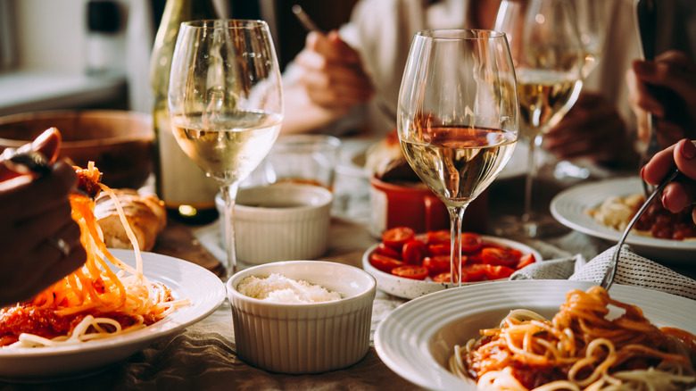 Olive Garden isn't the first restaurant to allow patrons to bring in their own outside wine. It's a fairly common practice but it's not without its drawbacks. Bringing that bottle in isn't free – most restaurants charge what is known as a "corkage fee" to open it for you. Sommelier Sur Lucero spoke about corkage fees in an interview with Insider, saying, "Most fine dining restaurants charge a nominal corkage fee, typically $35 per bottle, to bring your own wine... for that, they will chill or decant as necessary and serve the wine in beautiful glassware." Sometimes, that fee can be pretty steep, costing more than a bottle off the menu.