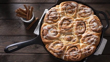 Choosing the right size pan and taking care to leave adequate space between your cinnamon rolls is important. If you crowd the rolls in the baking pan, they aren't going to bake evenly. There will be too much dough crowded together in the center of the pan. As the rolls bake in the oven, the tops will brown much more quickly, leaving the centers still soggy and uncooked. If you let them continue baking to get the centers fully cooked, the tops will become overdone.