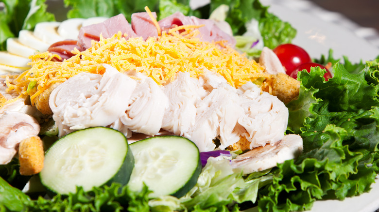 For example, if you have leftover roast beef, you might add sliced red onions or tomatoes to complement its flavor. If you have some salami deli meat you want to use up, add some peppers and olives and drizzle it with a nice Italian vinaigrette dressing. Once you've made your salad, you could also consider serving it on a wrap, instead of out of the salad bowl, if you prefer.