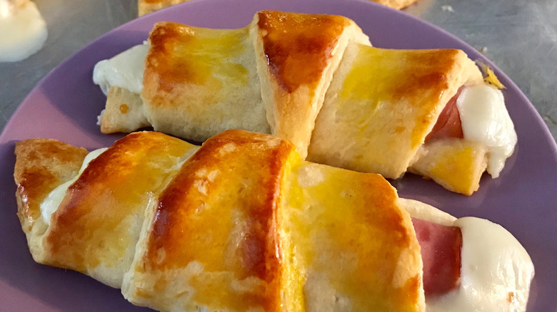 Once topped with the ham and cheese, you can roll up the crescent rolls and bake them according to the package directions. You'll need to add a few minutes to the recommended cooking time on the package. Once cooked, the resulting roll-ups will be tasty, thanks to the melted cheese and cooked lunch meat. Enjoy these upgraded crescent rolls as a snack, appetizer, or side (they work great with a soup or salad).