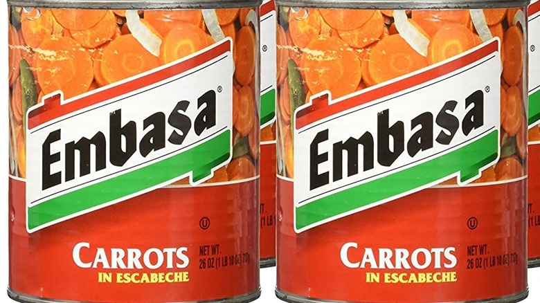 Embasa's bright red cans proudly announce its carrots as being "in escabeche." What's escabeche, the less Spanish-savvy among you might be asking? In essence, it's an umbrella term for a wide range of Spanish and Latin foods made with a vinegar-forward marinade, brine, or sauce. Embasa is referring to the Mexico-specific meaning of escabeche, which basically means these carrots come with onions, jalapenos, vinegar, a sprinkling of salt and sugar, and a variety of flavorful spices.