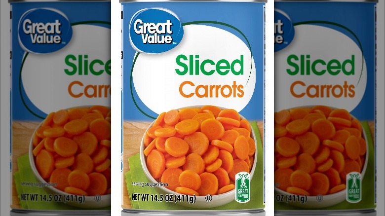 But in fact, Great Value's carrots are, well, great. They're a tad bit softer than other carrots on this list, but not in an unpleasant way. This tenderness makes them an excellent choice for glazing, as well as pureeing, which should interest all the smoothie aficionados out there. It's particularly easy to toss a can of these carrots into a soup or stew for a little extra flavor, texture, and nutrition. They're also remarkably consistent — you won't crack a tooth on any randomly tough chunks, or find yourself swallowing a bizarrely tasteless carrot coin. Great Value's canned carrots are just plain yummy and seriously cheap. What more could a cook ask for?