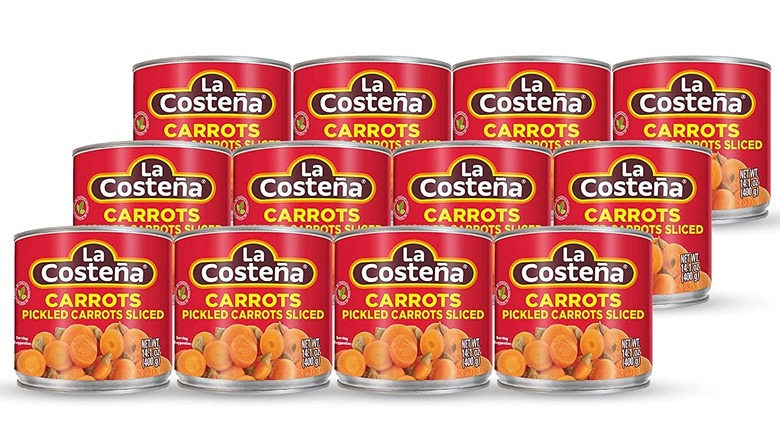 La Costeña's carrots are a little different from the other entries on this list. Yes, they're sliced and come ready to eat in a can, but that's not all that's waiting for you under that shiny metal lid. There are also jalapeno pepper chunks, a tangy glug of vinegar, pungent onions, and a variety of piquant spices. Don't go thinking this is a vegetable medley — the can advertises sliced carrots, not carrots, jalapenos, and onions. The carrots are, without question, front and center, and the added ingredients serve them. But there's no denying this product stands out from the pack.