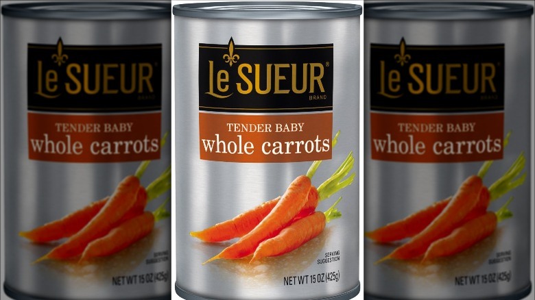 Le Sueur takes canned veggies seriously. The brand doesn't just sell preserved produce — it specifically offers very young sweet peas, shoepeg corn, and whole baby carrots. Most canned carrots come sliced, diced, or otherwise processed — just look at the rest of this list. Not so with Le Sueur: These are baby carrots in their entirety, making them uniquely versatile and an excellent choice for side dishes. Glazed carrots, roasted carrots, and delicate carrot salads can all use sliced carrots, but there's something undeniably elegant about seeing them presented in their unadulterated form. As one Amazon customer put it, "They give a nice 'upscale restaurant' look to dishes, especially when entertaining." Being able to bring that sort of class to dinnertime without having to shop for fresh carrots that might spoil in the crisper is a genuine delight.