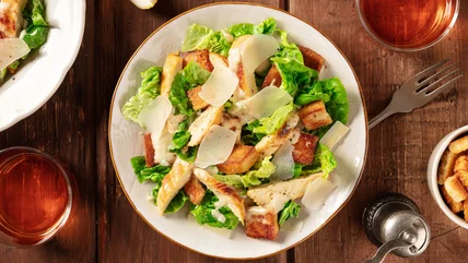The varied elements of a Caesar salad can be a lot for wine to compete with, so you don't want anything wimpy that'll get overpowered. Some great options are wines like Chablis, Albariño, or even pinot grigio. If you're adding the grilled chicken, then you might also want to consider something that's been oaked, such as a chardonnay, to help keep up with those richer flavors. Other good options are French rosés. These tend to be nicely acidic with notes of fruit that pair well with salads, and they share the refreshing crispness of a white wine.
