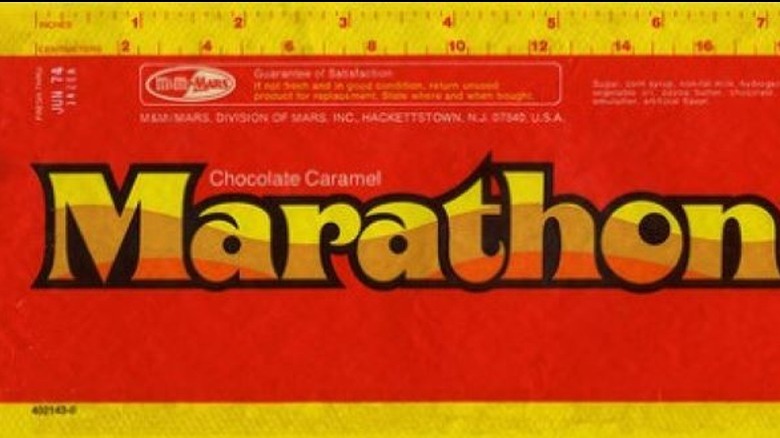 Marathon Bars looked like attached miniature chocolate pretzel ropes and were satisfyingly chewy. They contained sugar, peanuts, cocoa, cocoa butter, milk fat, and natural vanilla extract and seemed surprisingly light, but that made sense since they weren't dense. Now, Cadbury makes a Curly Wurly bar in the U.K. — it's also stretchy and can be ordered online.
