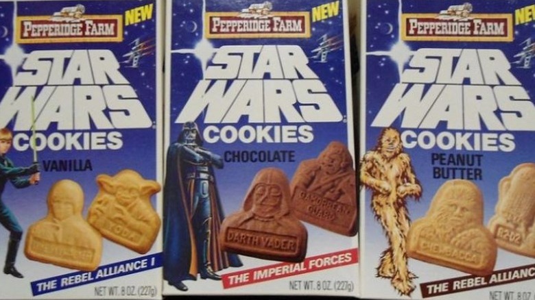 Everyone's face still lights up when they find Pepperidge Farm cookies in their lunch boxes, and the company entered the movie-related food merchandising arena several decades ago. It happened in 1983, the same year that "Return of the Jedi" was released. Pepperidge Farm made three flavors of these cookies: chocolate, vanilla, and peanut butter. There were pictures of Darth Vader, Luke Skywalker, and C-3PO on the boxes, and the cookies were shaped like them and other "Star Wars" characters.