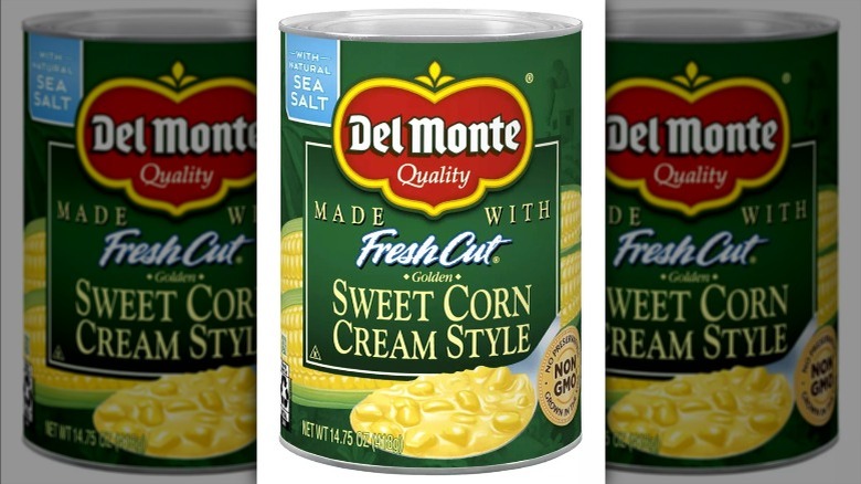 Creamed corn is easy enough to make, but if you don't have the ingredients or energy to do so, there are canned options that have your back. And one of the best is Del Monte Sweet Corn Cream Style. Del Monte's creamed corn offering is priced reasonably and has a super-short ingredients list, made from water, corn, and several other components. Despite not having dairy in it, it has a smooth, creamy taste.