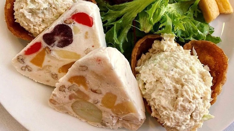 The 1929 cookbook "Salads and Sandwiches," published by the Woman's Institute of Domestic Arts and Sciences, features a recipe that differs slightly from its later counterparts (namely: it calls for eggs and a double broiler to make the creamy binder). However, pineapple chunks and maraschino cherries still play starring roles. Considering the cookbook's release coincides with the start of the Great Depression, canned fruit may have been a frugal choice for cash-strapped home cooks. In an era of financial strife, the frozen fruit salad played as a deceptively decadent treat and can still be enjoyed today.