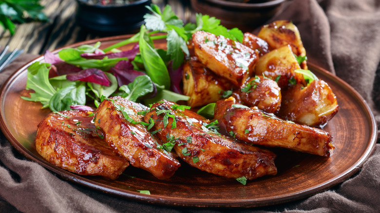 If you've ever cooked pork in a pan all by itself — without any oil, sauce, or spices — you'll notice that it doesn't exactly look too appetizing by the time it's finished cooking. Rather than a caramelized golden brown, the meat usually ends up being a white or grayish color. While the main purpose of seasoning pork is to add flavor, it also plays a major role in caramelization: Without it, you'll be left with a fairly bland, colorless cut of meat.