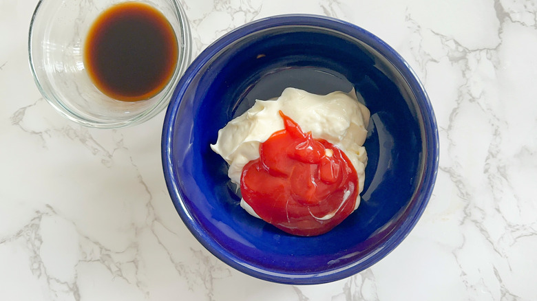 First things first, grab a small bowl from your cupboard. Then, using a spoon, scoop the mayo and the ketchup into a bowl. Carli notes, "Every good fast food sauce starts with a base of ketchup and mayo, like my personal favorite copycat In N Out Sauce."