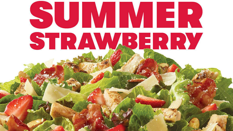 In a June 5 news release, Wendy's announced the return of its Summer Strawberry Salad, long considered a favorite of its craft salad lineup. Its popularity is due to the summery ingredients that go into it, including grilled chicken, Tuscan cheese, smoked bacon, and — of course — fresh, ripe strawberries, all topped with a champagne vinaigrette to add another blast of seasonal brightness. It's a bold salad that highlights one of summer's best berries, and it's even spawned a TikTok hack that swaps in spicy chicken nuggets for those who like a little crunchy heat with their sweet.