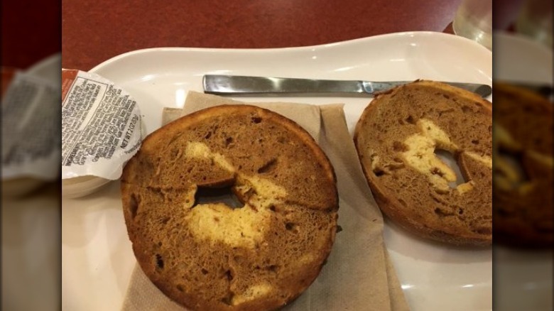 Unfortunately, Panera Bread decided to discontinue its French Toast Bagel in 2020. This decision came as part of a line of cuts that took place during the COVID-19 pandemic. Customers originally were under the impression that the menu item would return once restaurants opened back as normal, but it quickly became evident that this discontinuation was permanent. Like other discontinuations, Panera Bread released a similar replacement item that die-hards aren't pleased with. You can now order the Cinnamon Crunch Bagel, which fans of the French Toast Bagel said doesn't taste quite the same. The biggest difference is in the texture, and that the cinnamon bagel is topped with sugar and lacks a bagel hole. Looks like you'll have to shop around elsewhere if you've got a craving for French toast bagels.