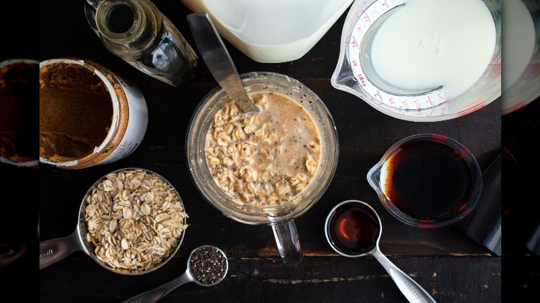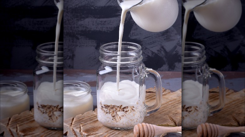 The next time you make overnight oats, make sure that you don't leave them sitting out on the counter for too long. Leaving them out for too long — either when you're in the process of combining the ingredients or the following morning before you start eating them — can threaten your health. Milk is a perishable ingredient. Whether mixed in with the oats or alone, it should not remain out of the fridge for longer than two hours at the most.