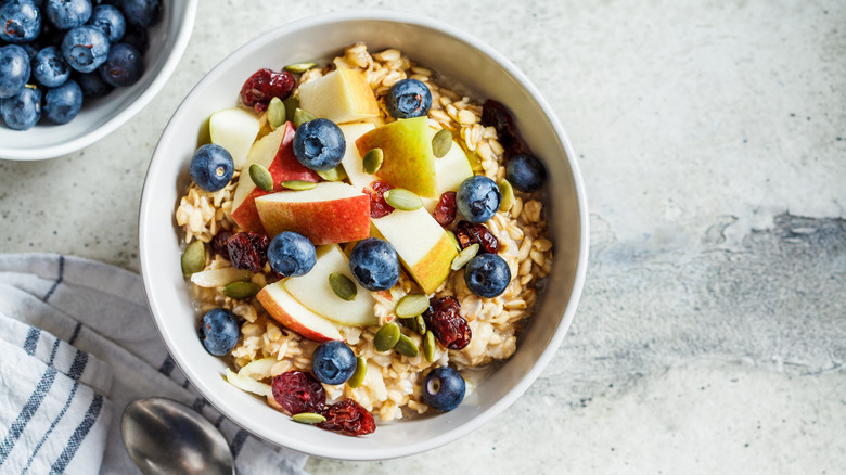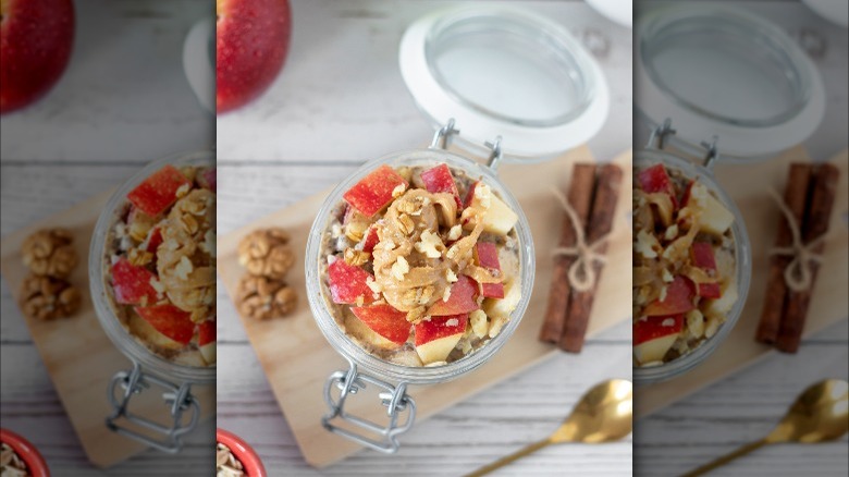 One of the biggest mistakes people make when preparing overnight oats is not adding the toppings at the right time. Many toppings should not be added until right before you're ready to dig into your oats. If you add fresh fruit, nuts, granola, and many other toppings when you're mixing the overnight oats in the evening, they're going to be soggy by the morning. Sitting in the milk will change their texture, and likely in a way that you won't enjoy. Put these toppings aside and only add them immediately before you're ready to eat your oatmeal.