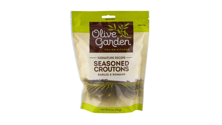 Sure, who needs to make Olive Garden salads at home when they're all you can eat at the restaurant, but you can't sit down at a restaurant any time you'd like. If you're making your own salad at home you can still mimic the brand's famous salads using its signature croutons. Yes, that's right, the Olive Garden Signature Recipe Seasoned Croutons with garlic romano cheese flavoring are actually widely available.