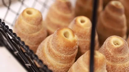 Jeremy Carlson told the Sharks he was first exposed to what he now calls Crispý Cones when he saw them being sold on the streets of the Czech Republic. Less waffle cone than puff pastry, the Crispý Cone — called the trdelník in Czech — is made by stretching and wrapping fresh dough around a spit or spindle called a "trdlo." From there, it's cooked to crispiness in rotisserie style before being covered in cinnamon, sugar, and other crumbly sweets. It's also filled with spreads, ice cream, and fruit, then adorned with toppings.