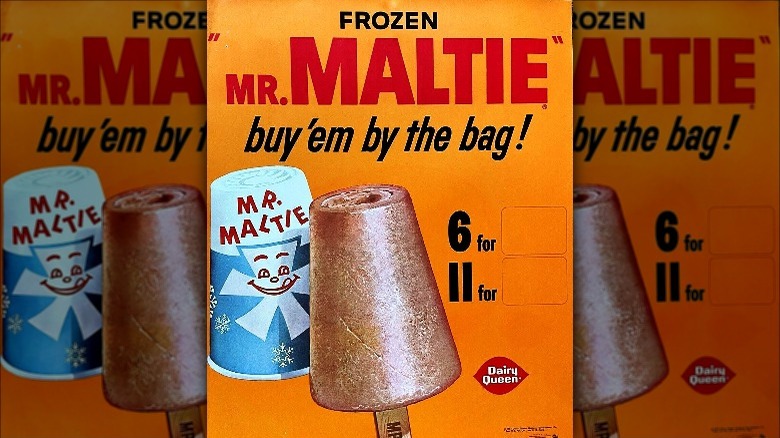 In the wide world of foods and drinks with Mr. and Mrs. in the name, this Dairy Queen dessert might not be the first to come to mind. Shaped like a pail, Mr. Maltie ice cream pops were chocolate malt frozen treats on a stick. They may have been released as early as 1961 in St. Louis before formally being introduced to mouths in 1963. Mr. Maltie is simple in design, with only a lick-smiling snowflake-looking mascot.