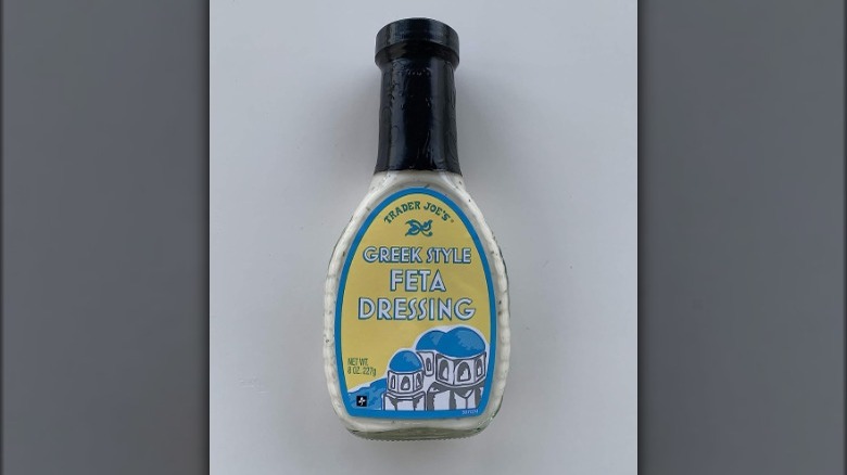 While salads can come in a seemingly infinite amount of forms with as many ingredients as you can fit into a bowl, certain salads exist with a very specific and recognizable list of veggies, including Greek salads. The usual markings of a Greek salad include olives, cucumbers, and feta cheese drizzled with a vinaigrette. Trader Joe's takes the guesswork out of what dressing would match your Greek salad best by selling its own Greek-Style Feta Dressing.