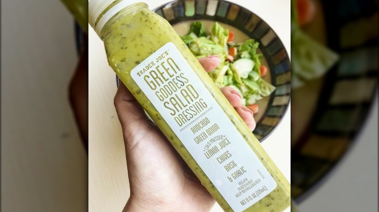 In the world of salads, the phenomenon of Green Goddess Dressing has risen in popularity over the years. Not only can you now find the formula of dried chives, dried green onion, spinach powder, and dried parsley in the seasoning form at Trader Joe's, but the grocery chain also sells two different varieties of the dressing. Both its shelf-stable and refrigerated Green Goddess Dressings are big hits with shoppers, with one on Reddit sharing, "The shelf stable Goddess Dressing is always my go-to. It has zero sugar and no dairy and it stores in the pantry for months. I always like having a bottle on hand."