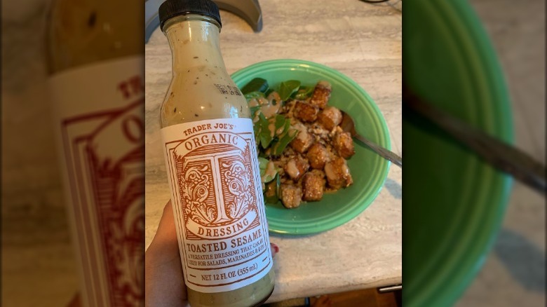 Trader Joe's Rants shared in a review of the product, "I really like this. It is delicious as well as versatile...Versatile as in, this is more than just for salads. It is also an excellent marinade which you can use to marinate many foods." The next time you want to fire up the grill, let your chicken marinate in the Toasted Sesame Dressing before cooking for a great boost in flavor. Toss it with your salad, marinate your next dinner with it, or use it as a dipping sauce for any meal. In the world of versatile dressings that can be used in multiple ways, the Organic Toasted Sesame Dressing is a solid go-to option.