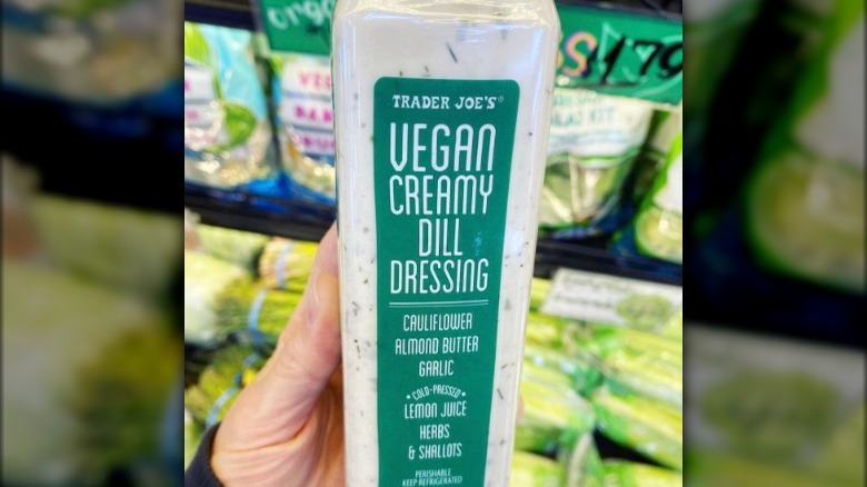 A common hurdle for shoppers to navigate if they follow Vegan diets is finding a substitute for a creamy dairy product that tastes just as good and still checks all the right boxes in terms of texture. Salad dressings are no exception, and while some individuals following a Vegan diet may actually prefer to stick to vinaigrettes, others may want to dabble in creamier dressings every now and then. In those situations, Trader Joe's sells a Vegan Creamy Dill Dressing. The dressing uses a base of cauliflower, almond butter, and vinegar to achieve ideal creaminess, and then infuses that with other flavors like garlic, shallots, parsley, chives, and of course, dill.