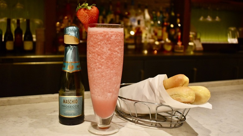 Olive Garden also offers an interesting twist on the more traditional presentation of the drink: both their peach and strawberry bellinis are available as frozen drinks, and while some purists may balk at the idea, it's kind of revolutionary — and very delicious. Priced at $7.50, the strawberry bellini is a sweeter drink no matter the consistency, though it is more difficult to taste the prosecco (Cantine Maschio Extra Dry) in its frozen variation. Even so, it's smooth, fruity, and refreshingly different — and if you're truly concerned about the alcohol content, you can always ask your bartender to go heavy on the prosecco.