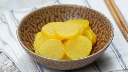 Danmuji is enjoyed most often alongside a variety of Asian dishes. The side dish was actually first created in Japan, where it is called takuan. The origin story goes that a priest by the name of Soho Takuan invented the dish sometime during Japan's Edo period. When the Shogun Iemitsu Tokugawa visited the priest, he praised the taste of the pickled radishes and decided that the dish should be named after the person who invented it.