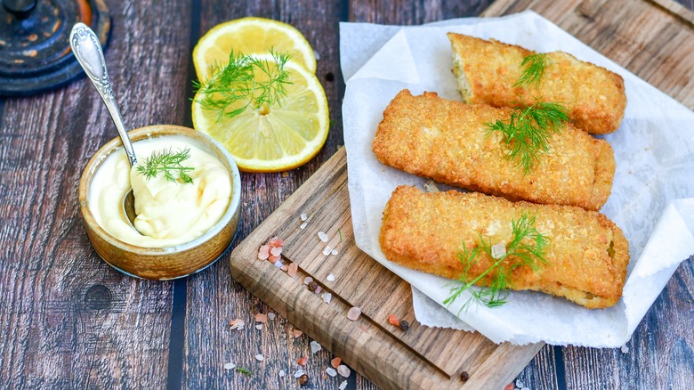 Whether you plan to season your fish sticks or not, you should never skip this tip. Always drizzle, toss, or brush the fish sticks with your choice of oil before cooking. Because these come from the freezer, excess ice and water can melt while cooking and turn the crisp batter into mush. Adding a little extra oil will help get the perfect crunch on the outside that you've been craving. Different types of oil can also enhance the natural flavors of the oil and the fish. While vegetable oil is great for high temperatures, it offers little to no taste. However, high-quality olive oil can add a slightly fruity or earthy flavor that will work well with fish sticks. This trick goes a long way on a baking sheet in the oven, but it works best in an air fryer.