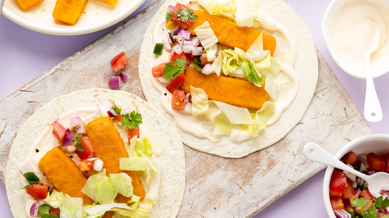 If Taco Tuesday isn't on the menu this week, you can also replace chicken tenders in most situations with fish sticks. Keep things simple and create a fish stick sandwich with fresh lettuce, a swipe of mayo, and throw on a few pickles for good measure. In just a few steps, you have a filling lunch or dinner. Do you have some leftover rice or quinoa that's taking up space in your fridge? Create a hearty rice bowl with fish sticks and a few simple ingredients that are probably already in your kitchen. Add chunks of fish sticks, some rice, and steamed broccoli to a bowl, drizzle the whole thing with spicy mayo, and sprinkle on some sesame seeds for a new favorite.