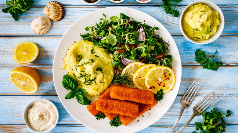 Never again serve up soggy fish sticks and call it a complete meal. Instead, give your dinner a little more care and attention. Pairing this frozen snack with the perfect side dish of satisfying carbs and healthy vegetables is another way to elevate the meal and make it feel like a gourmet experience. A classic side dish that complements fish sticks perfectly is crispy French fries, but you can still get even more imaginative. Consider making crispy sweet potato fries or potato skins, or elevate your fries with crumbled bacon, cheddar cheese, and green onions. The crunchy texture of the fries pairs well with the tender fish inside.